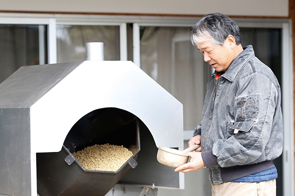 原農場で無農薬・無化学肥料栽培された大豆を自宅の加工場で焙煎します。